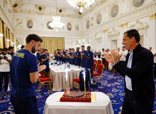 直播吧9月9日讯 9月8日是葡萄牙中场布鲁诺-费尔南德斯的生日,由于适逢国际比赛日,曼联队长和国家队队友度过了一个难忘的生日。